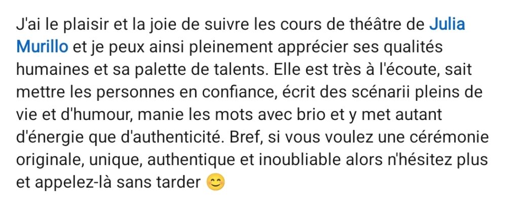 Le théâtre, c’est physique ! La gestuelle, l’attitude, tout cela concourt à la dynamique de votre cérémonie. Je vous rassure : je ne gesticule pas dans tous les sens. C’est justement tout un travail pour tomber juste dans ma posture : être présente sans en faire trop.